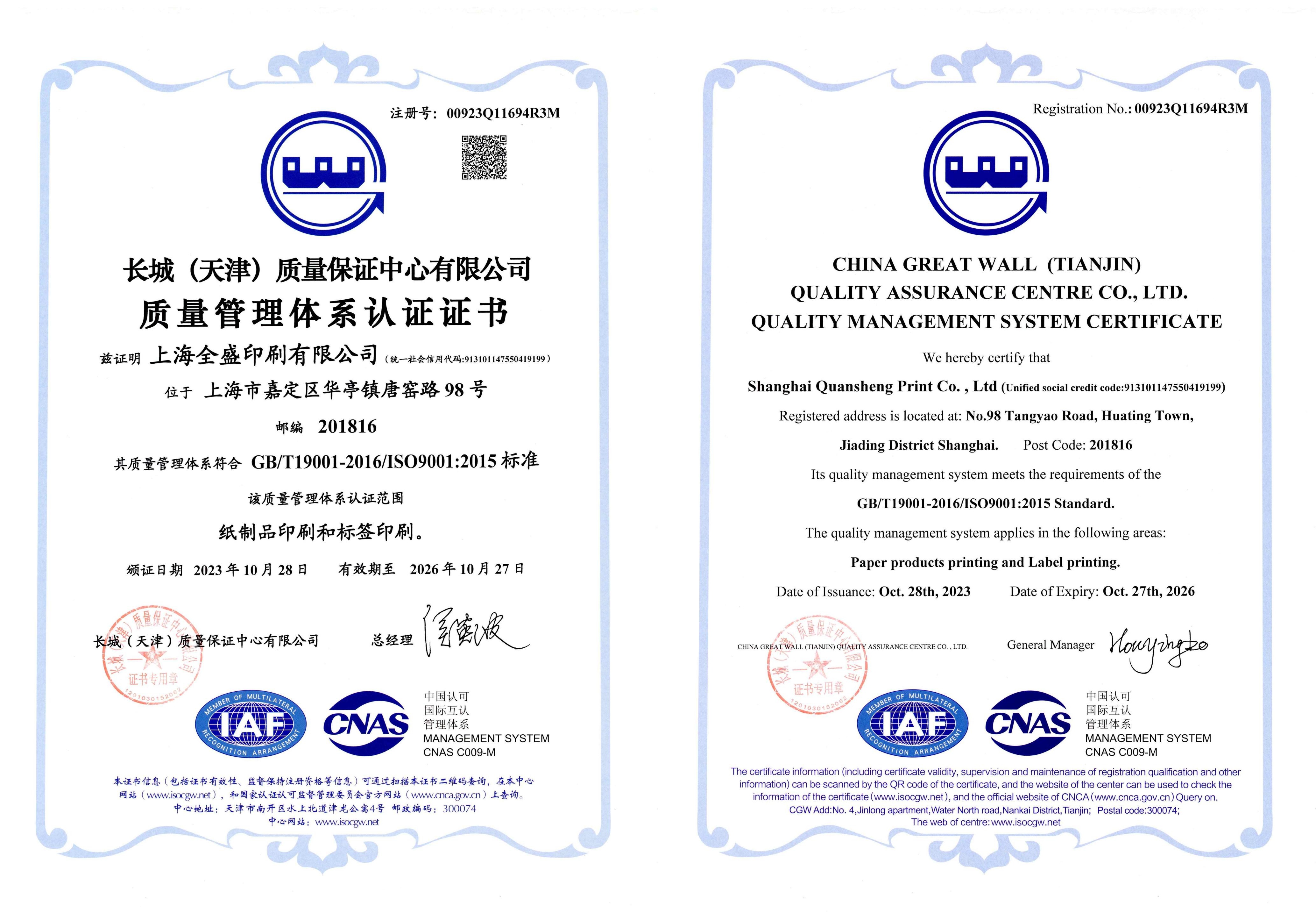 2023.10全盛结合企业实际情况,建立了一套科学、系统、全面的质量管理体系,获得ISO9001质量管理体系认证证书。